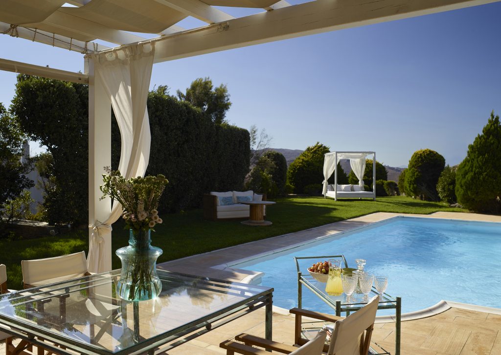 Enjoy the breathtaking panoramic views of the Aegean Sea and surrounding hilltops from the 5-bedroom Villa Phivi. Designed to extend across three levels, Villa Phivi accommodates up to ten guests in its five double bedrooms. For families or larger groups, one or two extra beds (or baby cots) can fit into the master bedrooms or common spaces of the villa.